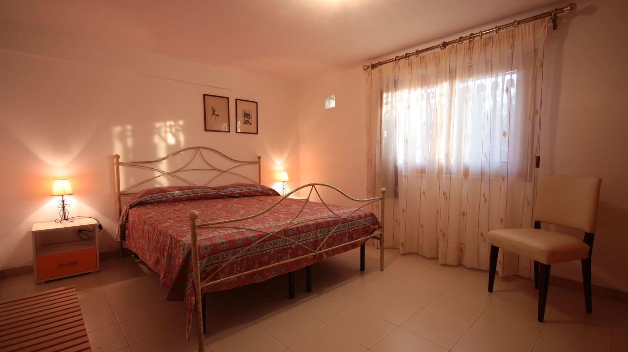 Appartamento di 50m2, al piano terra, con 2 camere da letto (la cameretta con letti a castello) e cucina abitabile, dotato di 1 bagno e veranda attrezzata con vista su mare e giardino.